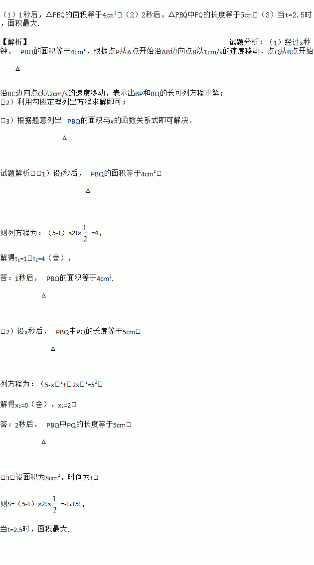 (3)在(1)中,当P,Q出发几秒时,△PBQ有最大面积?