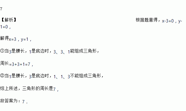 7 【解析】根据题意得,x-3=0,y-1=0, 解得x=3,y=1, ①当3是腰长,1是底边时,3、3、1能组成三角形, 周长=3+3+1=7, ②当1是腰长,3是底边时,1、1、3不能组成三角形, 综上所述,三角形的周长是7, 故答案为:7.
