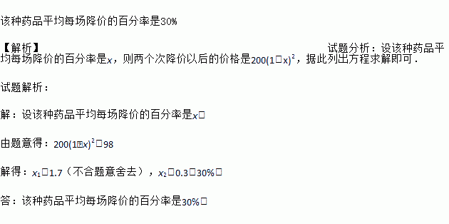 该种药品平均每场降价的百分率是30% 【解析】试题分析:设该种药品平均每场降价的百分率是x,则两个次降价以后的价格是200(1-x)2,据此列出方程求解即可. 试题解析: 【解析】 设该种药品平均每场降价的百分率是x, 由题意得:200(1﹣x)2=98 解得:x1=1.7(不合题意舍去),x2=0.3=30%. 答:该种药品平均每场降价的百分率是30%.