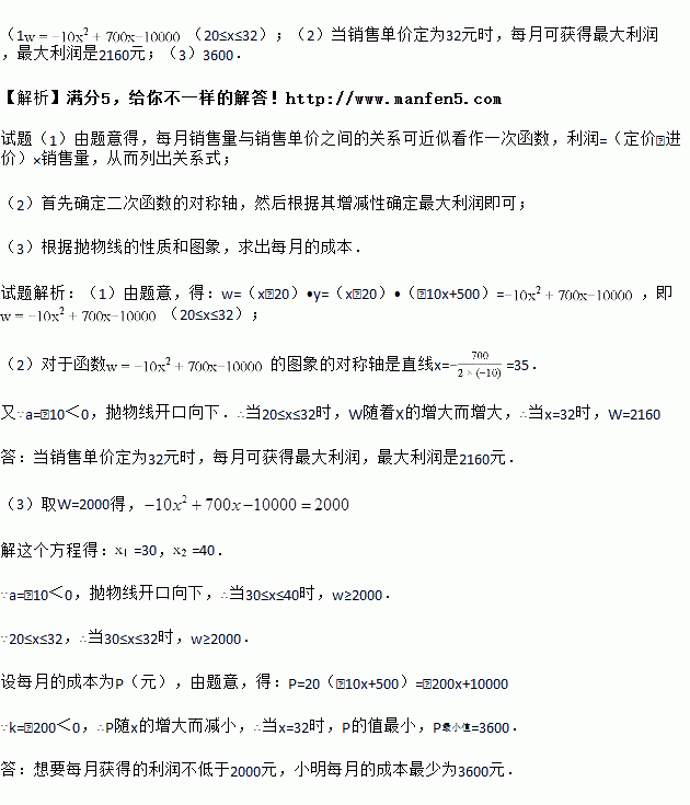 (3)如果小明想要每月获得的利润不低于2000元,那么小明每月的成本最少需要多少元?(成本=进价×销售量)