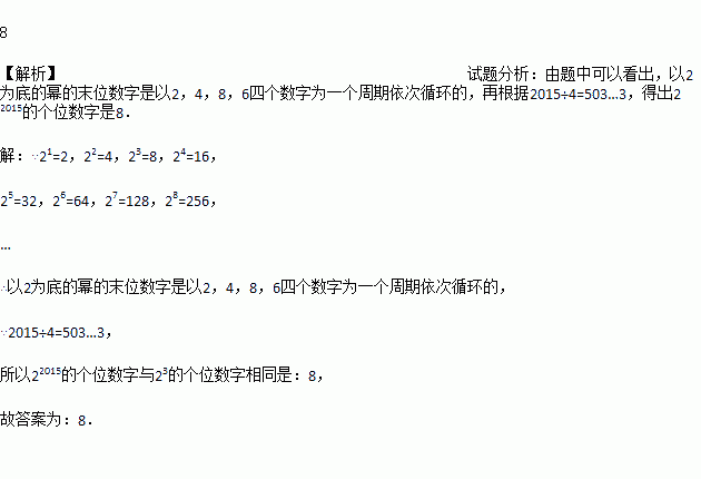 观察下列等式:21=2,22=4,23=8,24=16,25=32,26=64,27=128.通过观察,用你所发现的规律确定22015的个位数字是________.