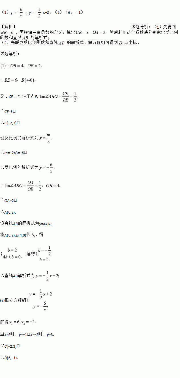 (10分)已知:如图,在平面直角坐标系xOy中,直线AB分别与x、y轴交于点B、A,与反比例函数的图象分别交于点C、D,CE⊥x轴于点E,tan∠ABO=