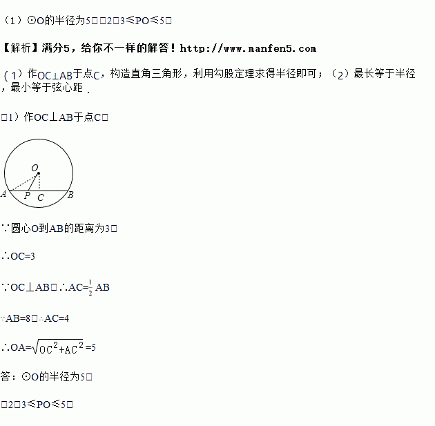 如图,在⊙O中,弦AB的长为8,圆心O到AB的距离为3.