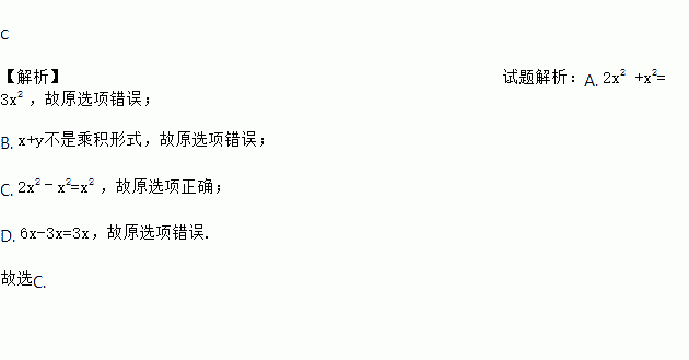A. 2x-x=x2 B. x+y=xy C. 2x2-x2=x2 D. 6x-3x=3