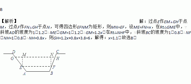 B 【解析】【解析】 过点E作EM⊥GH于点M,过点F作FN⊥GH于点N,可得四边形EFNM为矩形,则MN=EF,设ME=FN=x,在Rt△GME中,∵斜坡AD的坡度为1:1.2,∴ME:GM=1:1.2,∴GM=1.2x.在Rt△NHF中,∵斜坡BC的坡度为1:0.8,∴NF:NH=1:0.8,∴NH=0.8x,则GH=1.2x+0.8x+3.8=6,解得:x=1.1.故选B.