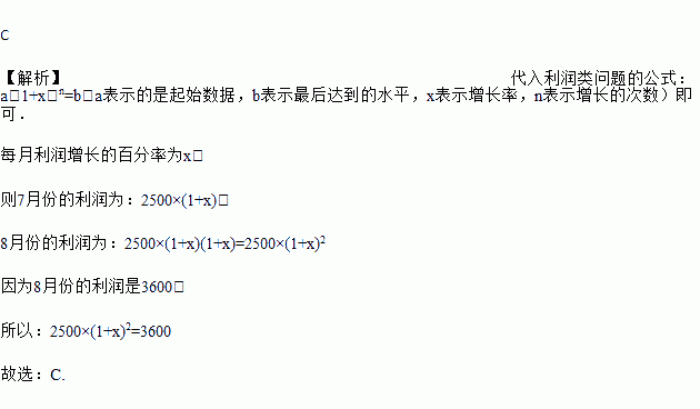 某商店6月份的利润是2500元,8月份的利润达到3600元.设平均每月利润增长的百分率是,则可以列出方程( )![]()