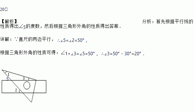 如图,将三角板的直角顶点放在直尺的一边上,∠1=30°,∠2=50°,则∠3=__________°.