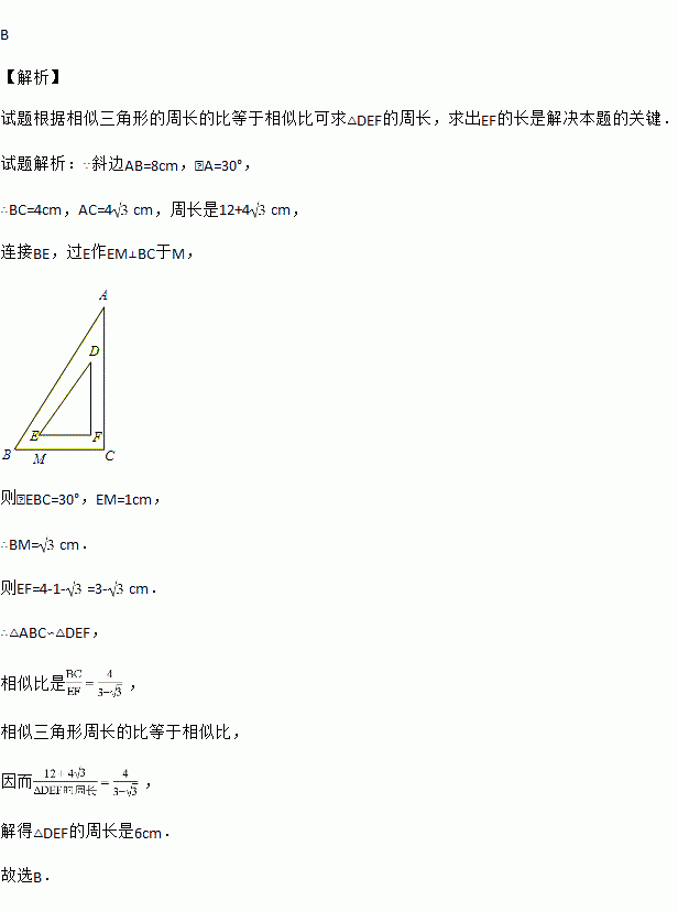 一块含30°角的直角三角板(如图),它的斜边AB=8cm,里面空心△DEF的各边与△ABC的对应边平行,且各对应边的距离都是1cm,那么△DEF的周长是( )