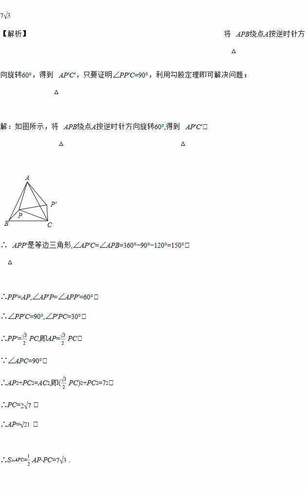 如图,在等边△ABC中,AC=7,点P在△ABC内部,且∠APC=90°,∠BPC=120°,则△APC的面积为___________