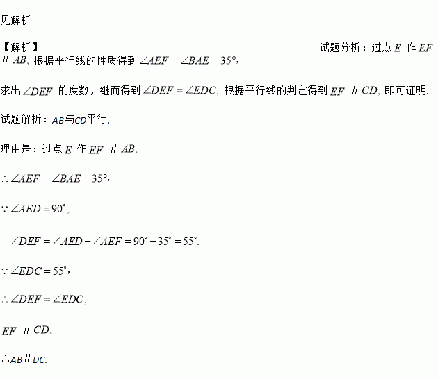 小明到工厂去进行社会实践活动时,发现工人师傅生产了一种如图所示的零件,要求AB∥CD,∠BAE=35°,∠AED=90°.小明发现工人师傅只是量出∠BAE=35°,∠AED=90°后,又量了∠EDC=55°,于是他就说AB与CD肯定是平行的,你知道什么原因吗?