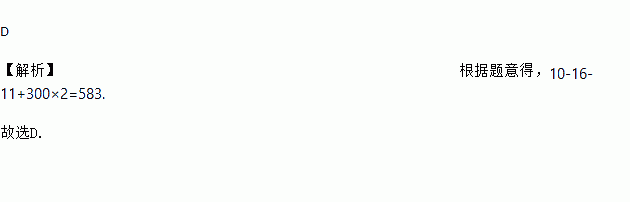 D 【解析】根据题意得,10-16-11+300×2=583. 故选D.