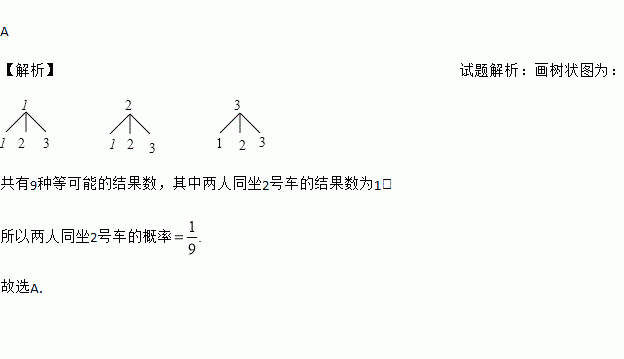 某校组织九年级学生参加中考体育测试,共租3辆客车,分别标号1,2,3,李军和赵娟两人可以任选一辆车坐,则两人同坐2号车的概率为( )