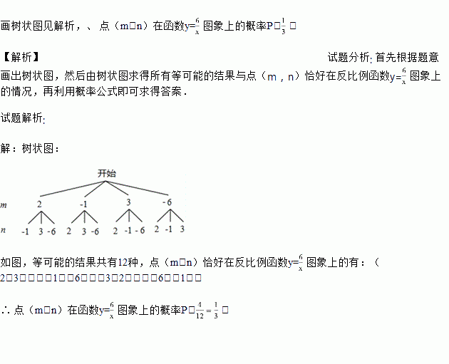 从﹣1,2,3,﹣6这四个数中任选两数,分别记作m,n,请用列表法或画树状图的方法,求点(m,n)在函数y=