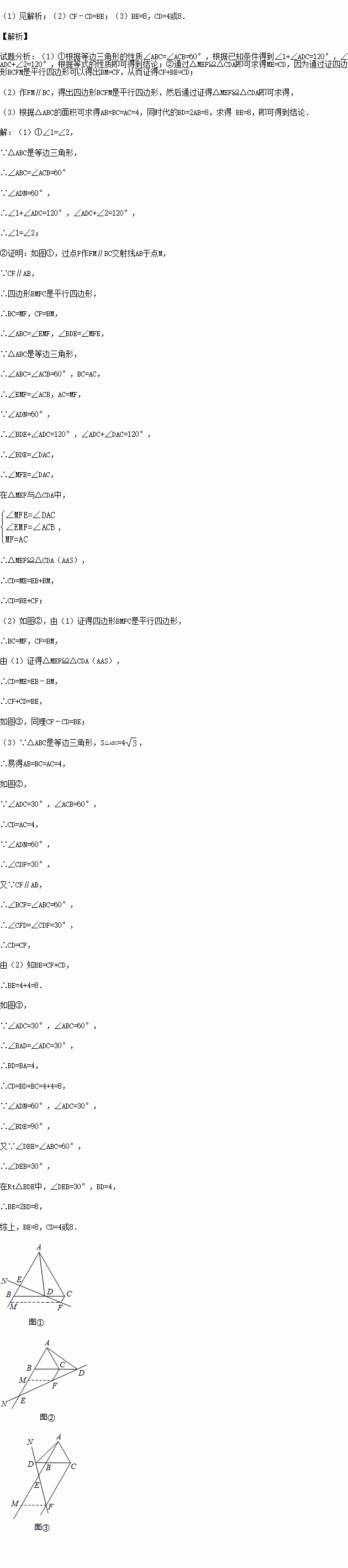 如图,在等边△ABC中,点D在直线BC上,连接AD,作∠ADN=60°,直线DN交射线AB于点E,过点C作CF∥AB交直线DN于点F.