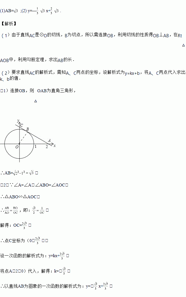 如图,圆 O 的半径为 1,过点 A(2,0)的直线与圆 O 相切于点 B,与 y 轴相交于点 C.