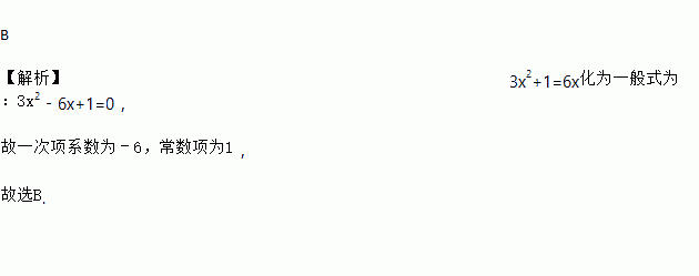 B 【解析】3x2+1=6x化为一般式为:3x2﹣6x+1=0, 故一次项系数为﹣6,常数项为1, 故选B.