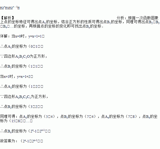 正方形A1B1C1O,A2B2C2C1,A3B3C3C2,…按如图的方式放置,点A1,A2,A3…和点C1,C2,C3…分别在直线y=x+1和x轴上,则点Bn的坐标为_____.