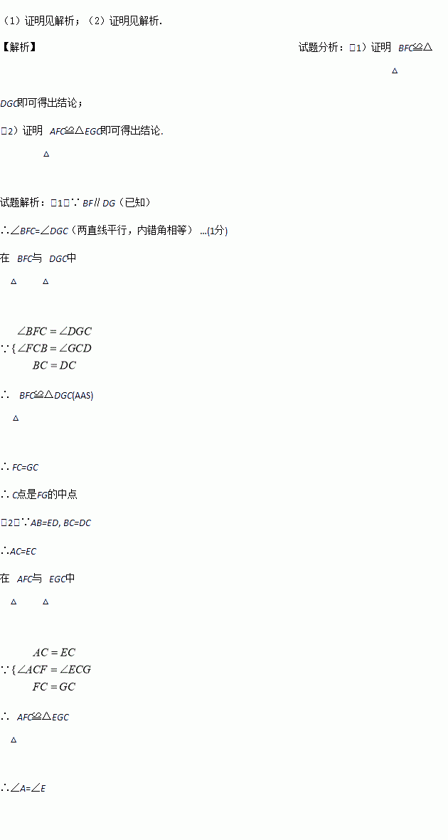 如图7,BF∥DG , BC=DC,AB=ED,点A、B、C、D、E在同一直线上。