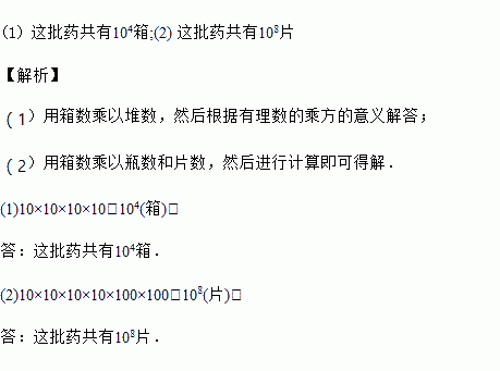 某药厂生产了一批新药,装箱后存放在仓库中,为了方便清点,按10×10×10箱一堆的方式摆放,共摆放了10堆,已知每箱装100瓶药,每瓶药装100片.