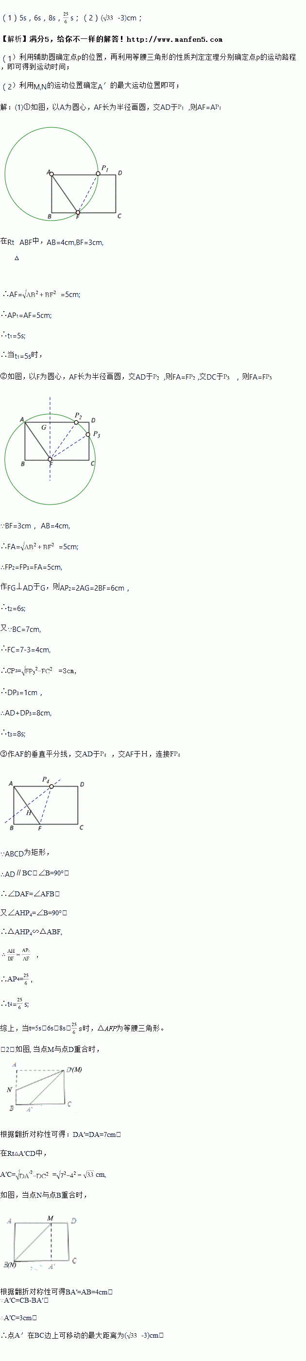 (1)点F在边BC上,且 BF=3,若点P从点A出发,以每秒1cm的速度沿A→D→C→F运动,设点P运动的时间为t秒,求当t为何值时,△AFP为等腰三角形?