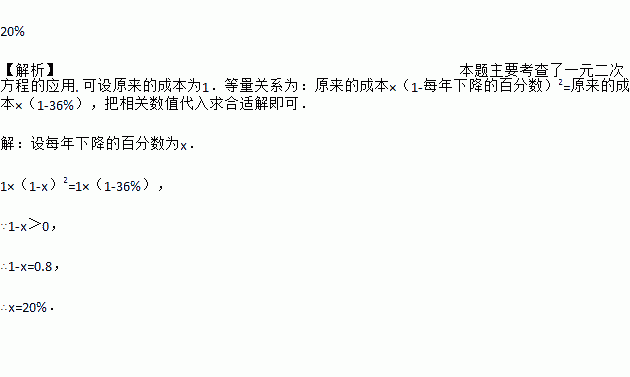 某电视机厂计划用两年的时间把某种型号的电视机的成本降低36%, 若每年下降的百分数相同,求这个百分数.