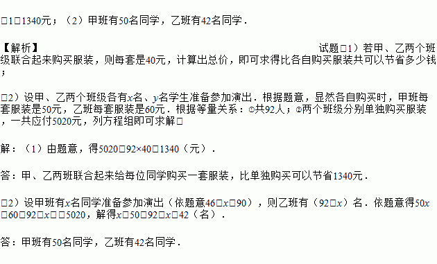 为举办校园文化艺术节,甲、乙两班准备给合唱同学购买演出服装(一人一套),两班共92人(其中甲班比乙班人多,且甲班不到90人),下面是供货商给出的演出服装的价格表:
