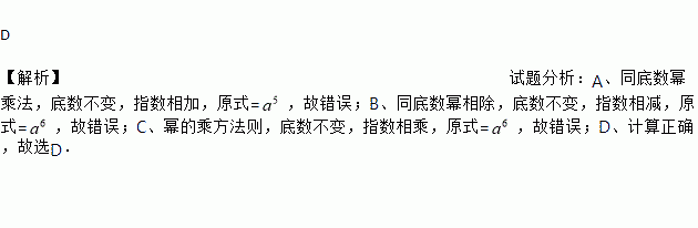 D 【解析】试题分析:A、同底数幂乘法,底数不变,指数相加,原式=,故错误;B、同底数幂相除,底数不变,指数相减,原式=,故错误;C、幂的乘方法则,底数不变,指数相乘,原式=,故错误;D、计算正确,故选D.