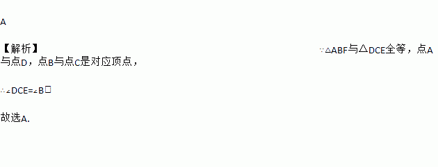 A 【解析】∵△ABF与△DCE全等,点A与点D,点B与点C是对应顶点, ∴∠DCE=∠B, 故选A.