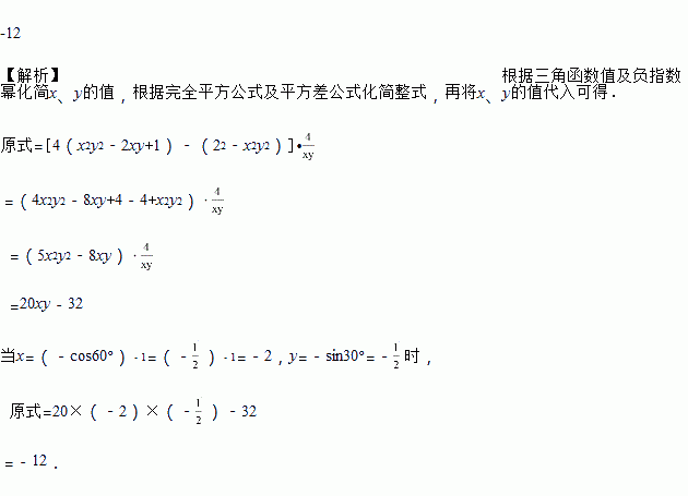求[4(xy﹣1)2﹣(xy+2)(2﹣xy)]÷xy的值,其中x=(﹣cos60°)﹣1, y=﹣sin30°.
