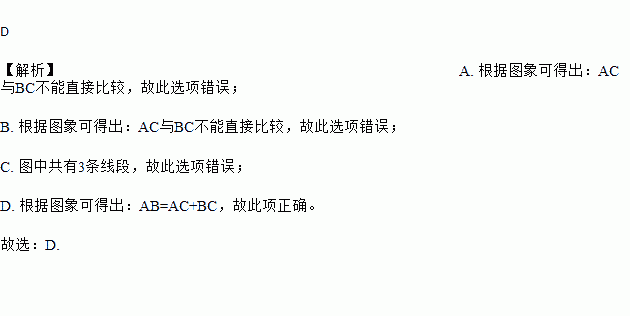 D 【解析】A. 根据图象可得出:AC与BC不能直接比较,故此选项错误; B. 根据图象可得出:AC与BC不能直接比较,故此选项错误; C. 图中共有3条线段,故此选项错误; D. 根据图象可得出:AB=AC+BC,故此项正确。 故选:D.