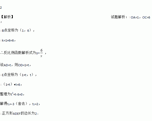 如图,四边形OABC是矩形,ADEF是正方形,点A、D在x轴的正半轴上,点C在y轴的正半轴上,点F在AB上,点B、E在反比例函数的图象上,OA=1,OC=6,则正方形ADEF的边长为 .