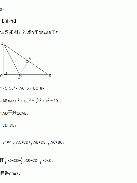 在Rt△ABC中,∠C=90°,AD平分∠CAB,AC=6,BC=8,CD= .