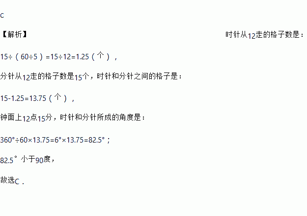 12点15分,钟表的时针与分针所夹的小于平角的角为( )