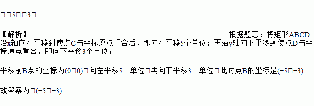 已知矩形ABCD在平面直角坐标系中的位置如图所示,将矩形ABCD沿x轴向左平移到使点C与坐标原点重合后,再沿y轴向下平移到使点D与坐标原点重合,此时点B的坐标是________。