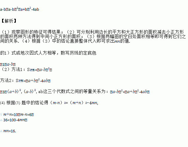 题中的等量关系,解决问题:若m+n=10,m-n=6,求mn的值.![]()