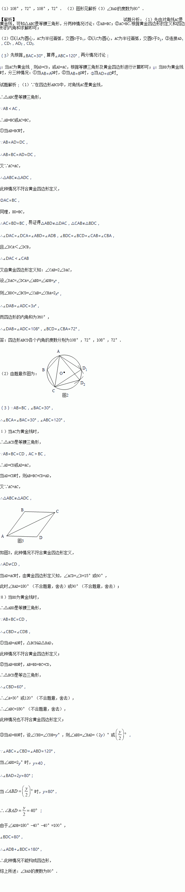 (3)在黄金四边形ABCD中,AB=BC=CD,∠BAC=30°,求∠BAD的度数.