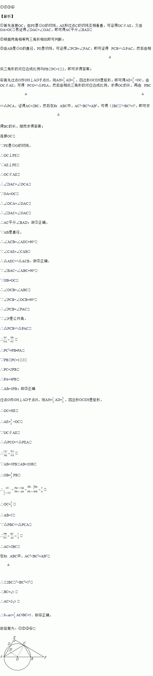 ,AD=3.给出下列结论:①AC平分∠BAD;②△ABC∽△ACE;③AB=3PB;④S△ABC=5,其中正确的是__________(写出所有正确结论的序号).