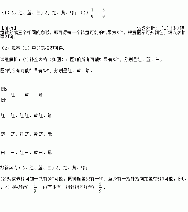 (1)3,红、蓝、白;3,红、黄、绿;(2) , 【解析】试题分析:(1)根据转盘被分成三个相同的扇形,即可得每一个转盘可能的结果为3种,根据图示可知颜色,填入表格中即可; (2)观察(1)中的表格即可得. 试题解析:(1)补全表格(如图):圆1的所有可能结果有3种,分别是红、蓝、白, 圆2的所有可能结果有3种,分别是红、黄、绿, 圆2 圆1 红 黄...