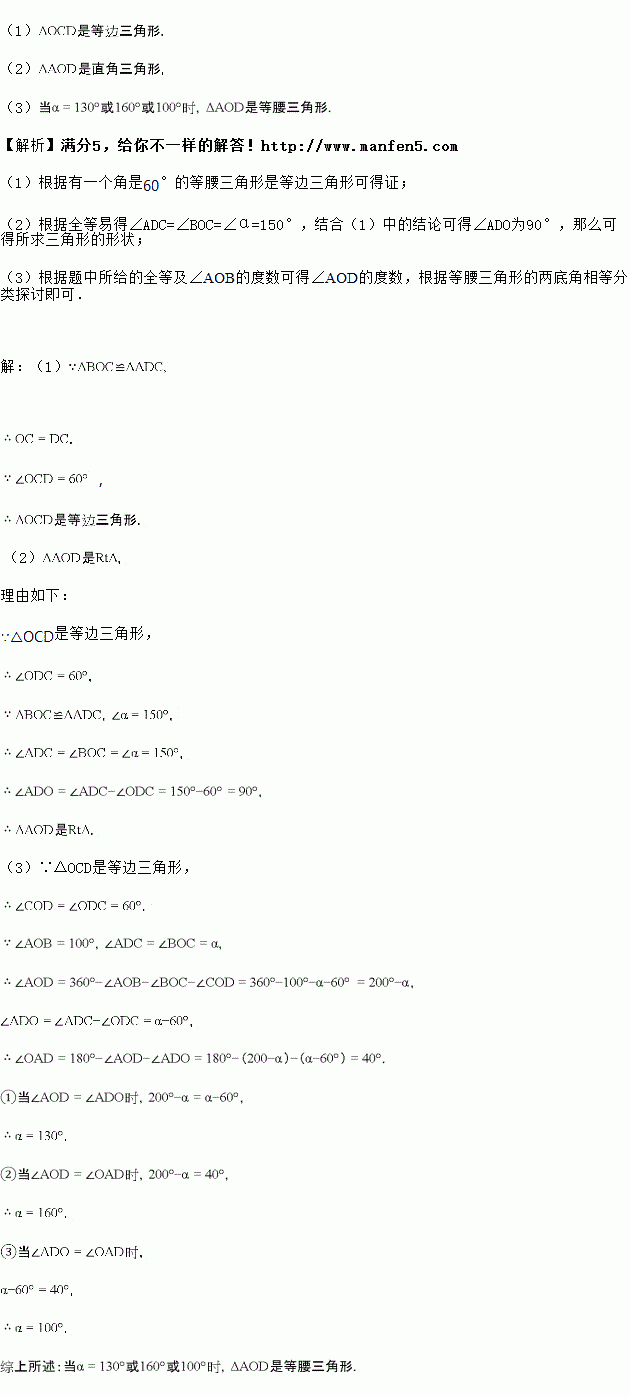 (2)当=150°时,请计算△AOD三内角的度数,并判断△AOD的形状;![]()