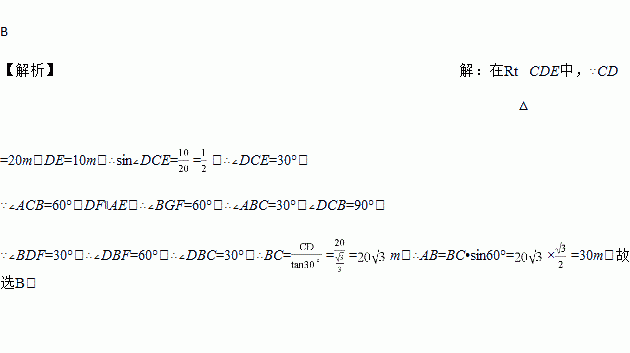 如图,学校环保社成员想测量斜坡CD旁一棵树AB的高度,他们先在点C处测得树顶B的仰角为60°,然后在坡顶D测得树顶B的仰角为30°,已知斜坡CD的长度为20m,DE的长为10m,则树AB的高度是