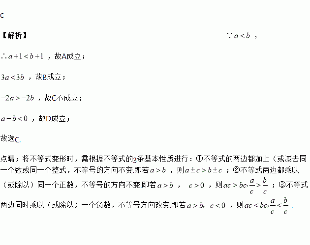 A. a+1<b+1 B. 3a<3b C. -2a<-2b D. a-b<0