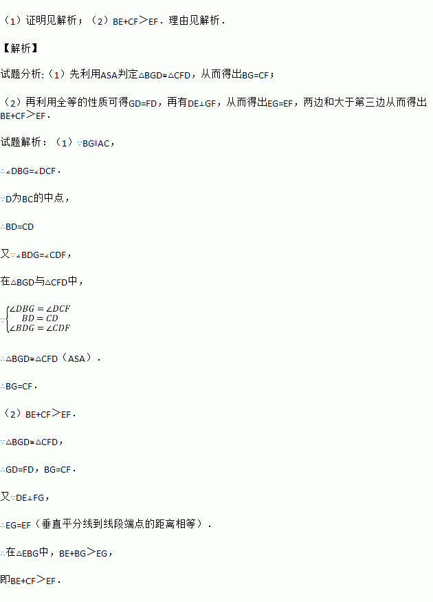 如图,△ABC中,D是BC的中点,过D点的直线GF交AC于F,交AC的平行线BG于G点,DE⊥DF,交AB于点E,连结EG、EF.