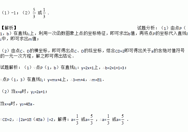 如图,直线l1:y=2x+1与直线l2:y=mx+4相交于点P(1,b)