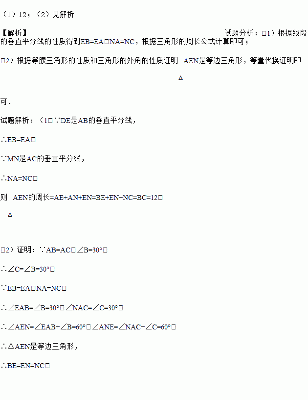 在△ABC中,AB=AC,BC=12,∠B=30°,AB的垂直平分线DE交BC边于点E,AC的垂直平分线MN交BC于点N.