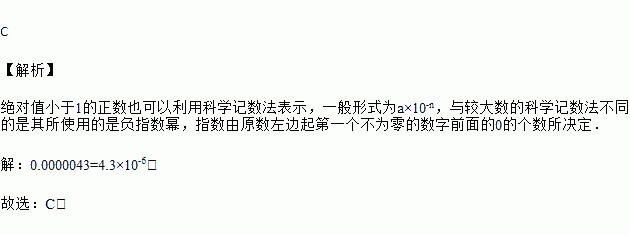 2015年4月,生物学家发现一种病毒的长度约为0.0000043米,利用科学记数法表示为( )