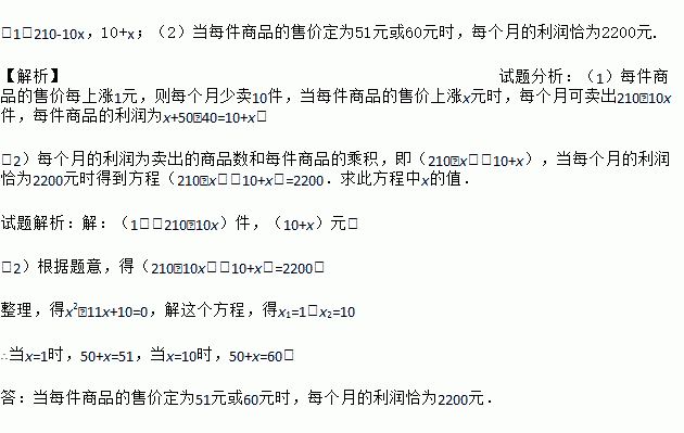 (1)210-10x,10+x;(2)当每件商品的售价定为51元或60元时,每个月的利润恰为2200元. 【解析】试题分析:(1)每件商品的售价每上涨1元,则每个月少卖10件,当每件商品的售价上涨x元时,每个月可卖出210﹣10x件,每件商品的利润为x+50﹣40=10+x; (2)每个月的利润为卖出的商品数和每件商品的乘积,即(210﹣x)(10+x),当每个月的利润恰为2200元时...