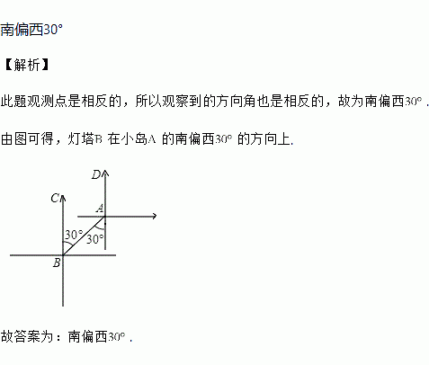 已知小岛A在灯塔B的北偏东30°的方向上,则灯塔B在小岛A的___的方向上.