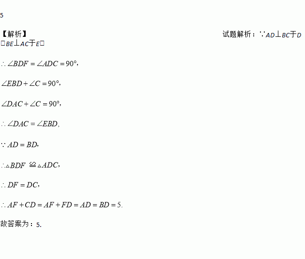 如图,在△ABC中,AD⊥BC于D,BE⊥AC于E,AD=BD=5,则AF+CD=___.
