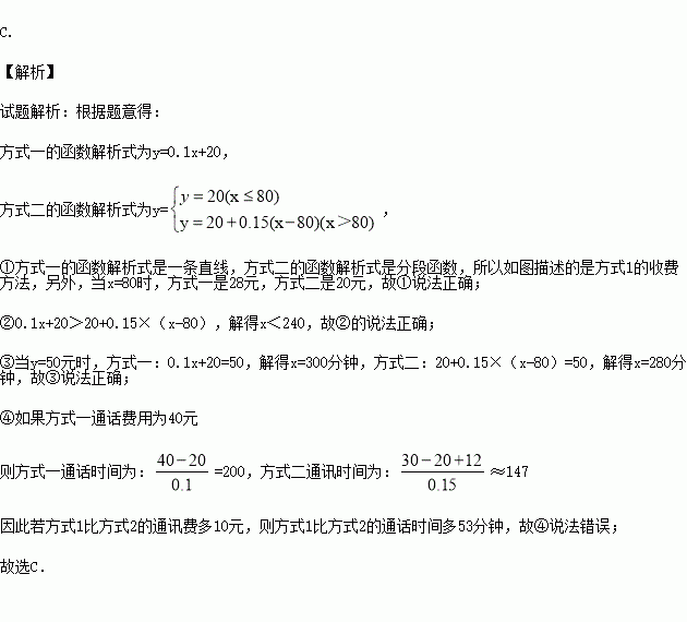 某通讯公司提供了两种移动电话收费方式:方式1,收月基本费20元,再以每分钟0.1元的价格按通话时间计费;方式2,收月基本费20元,送80分钟通话时间,超过80分钟的部分,以每分钟0.15元的价格计费.