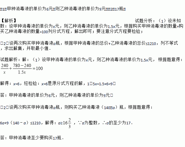 (1)甲种消毒液的单价为6元,则乙种消毒液的单价为9元;(2)17瓶. 【解析】试题分析:(1)设未知数:设甲种消毒液的单价为x元,则乙种消毒液的单价为1.5x元,根据购买甲种消毒液的数量+购买乙种消毒液的数量=100列分式方程,解出即可;要注意分式方程要检验; (2)设再次购买甲种消毒液a瓶,根据甲种消毒液的总价+乙种消毒液的总价≤1210,列不等式,求出解集,并取最小值. 试...